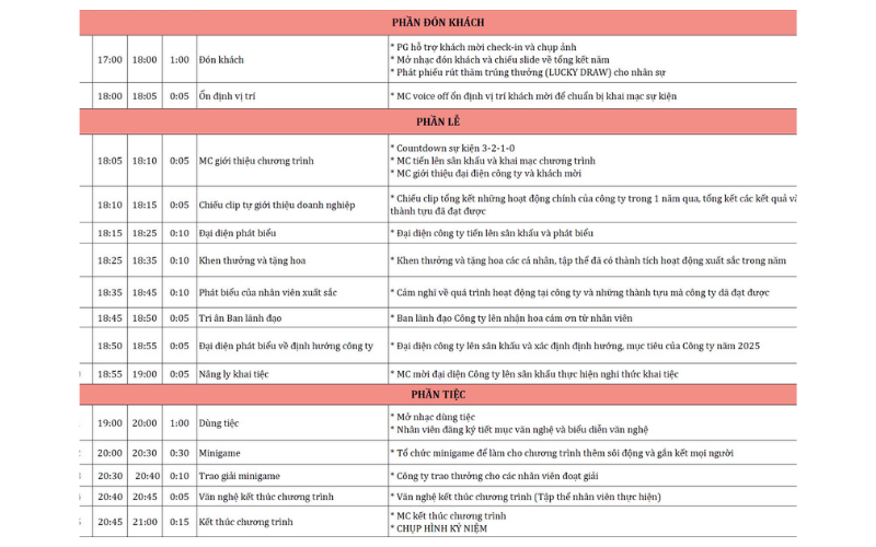 * Dự trù thời gian linh hoạt: Mỗi phần nên có khoảng đệm nhỏ cho các tình huống phát sinh (chậm giờ, khách VIP đến muộn…).